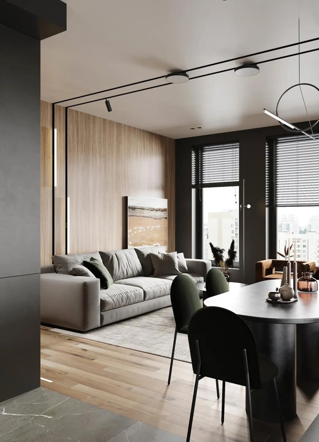 客厅以深色、柔和原木色为基调,营造舒适宁静的居家氛围,部分家具如扶手椅、餐椅等选用鲜明色彩点缀,增添个性和表现力。