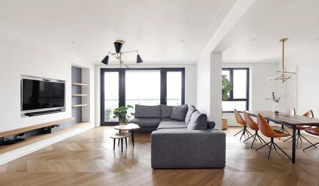 整个客厅是横厅的布局,沙发后方就是餐桌椅区域,没有独立的沙发墙;以洁净的白色空间色调为主,从天花到背景墙一片洁白的乳胶漆质感,搭配上鱼骨铺的木地板,还有灰色的布艺沙发,营造出一种轻松闲适的惬意感。