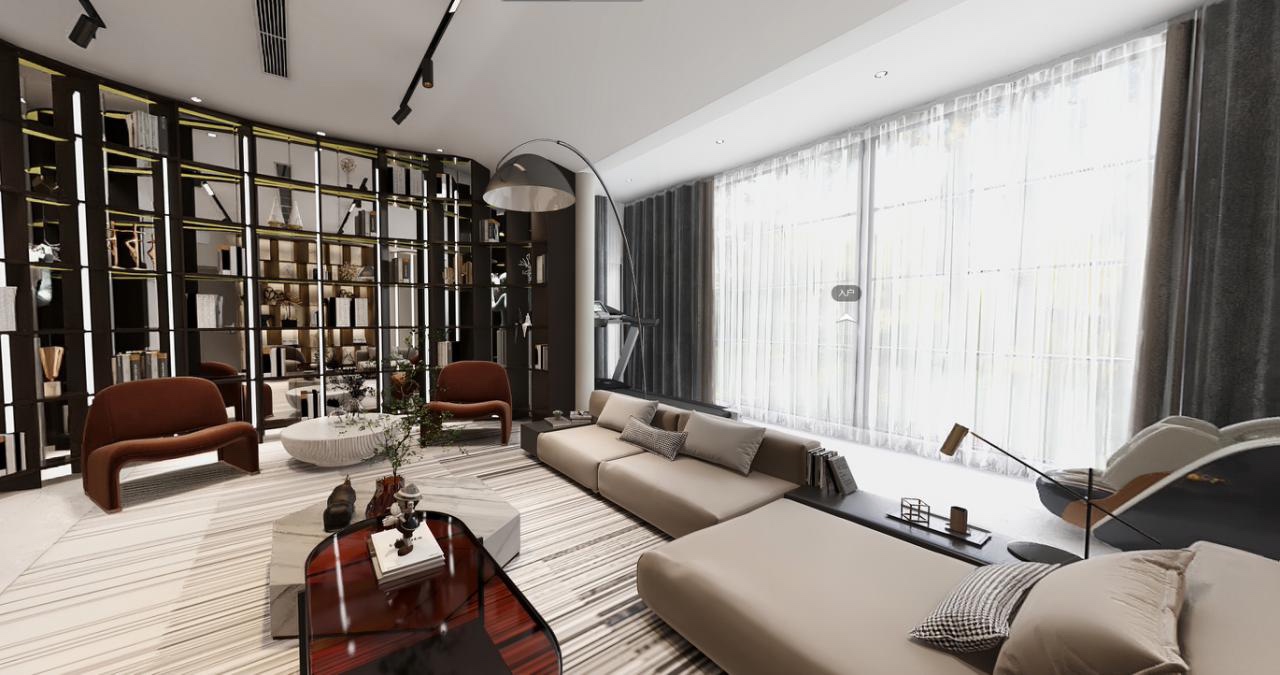 客厅的挑高天花板,多扇到顶的窗户,营造出开放通透的氛围,将室外的景色尽收眼底。配搭米色皮革沙发,异形茶几,散发低调奢华的气派。