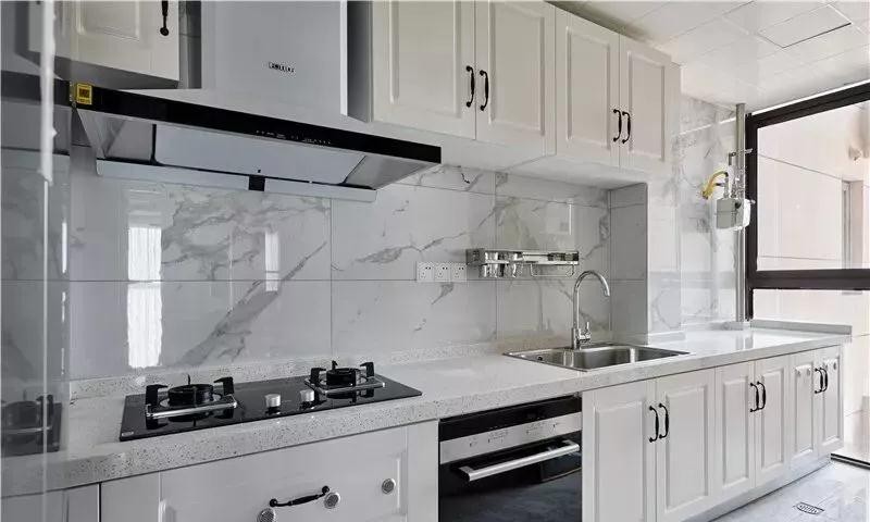 厨房墙面采用白色瓷砖,台面也是白色大理石,打通了外阳台,使得整个空间显得通透明亮。