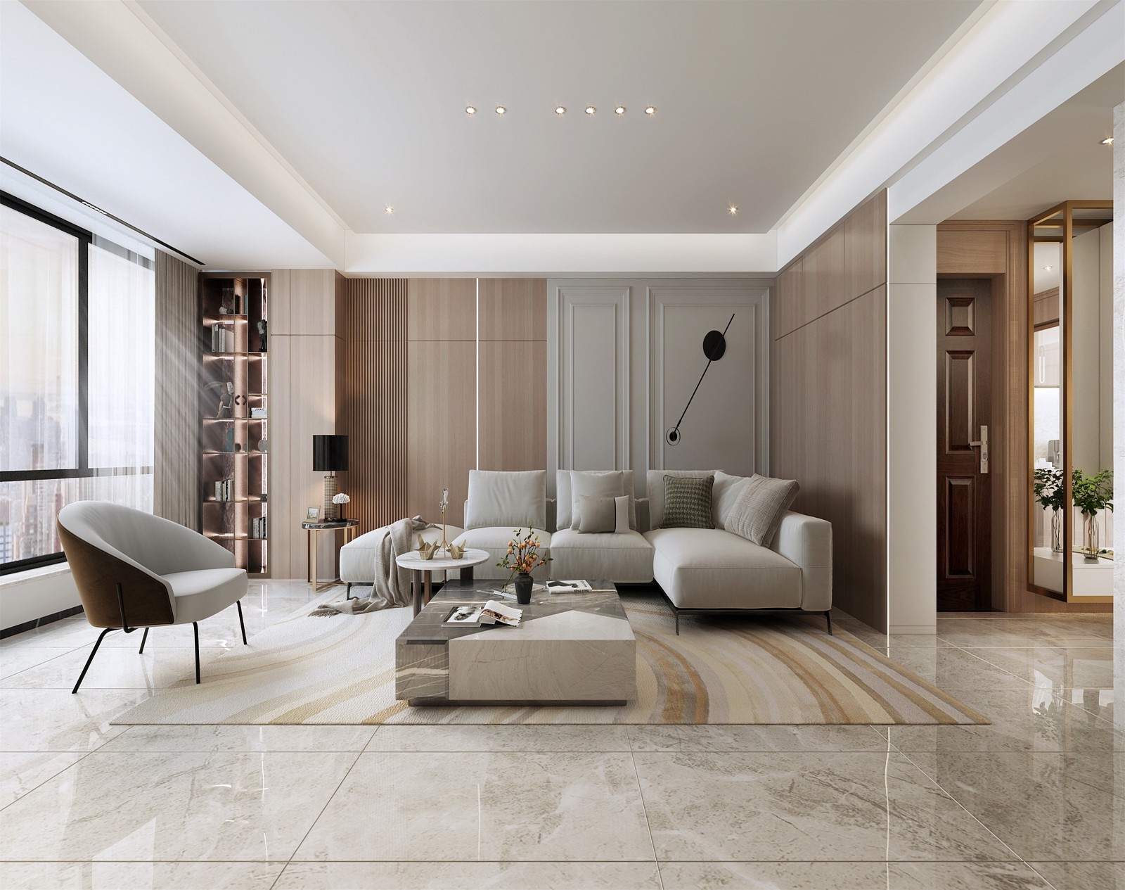 空间以现代轻奢原木木饰面材质为主,结合金属大理石等做点缀,整体空间中低调沉穩色彩