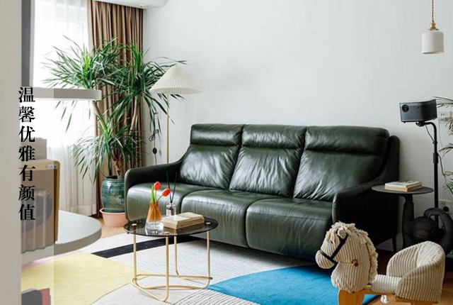 客厅里没有阳台也没有超大的落地窗,只有一个半高的窗户,搭配上轻柔的白色纱帘和奶茶色遮光帘,让进入室内的光线柔和了很多。客厅的颜色很干净利落,白色、木色,搭配墨绿色的皮质沙发和撞色的地毯,***再以绿植做点缀,轻盈中带着法式的浪漫。