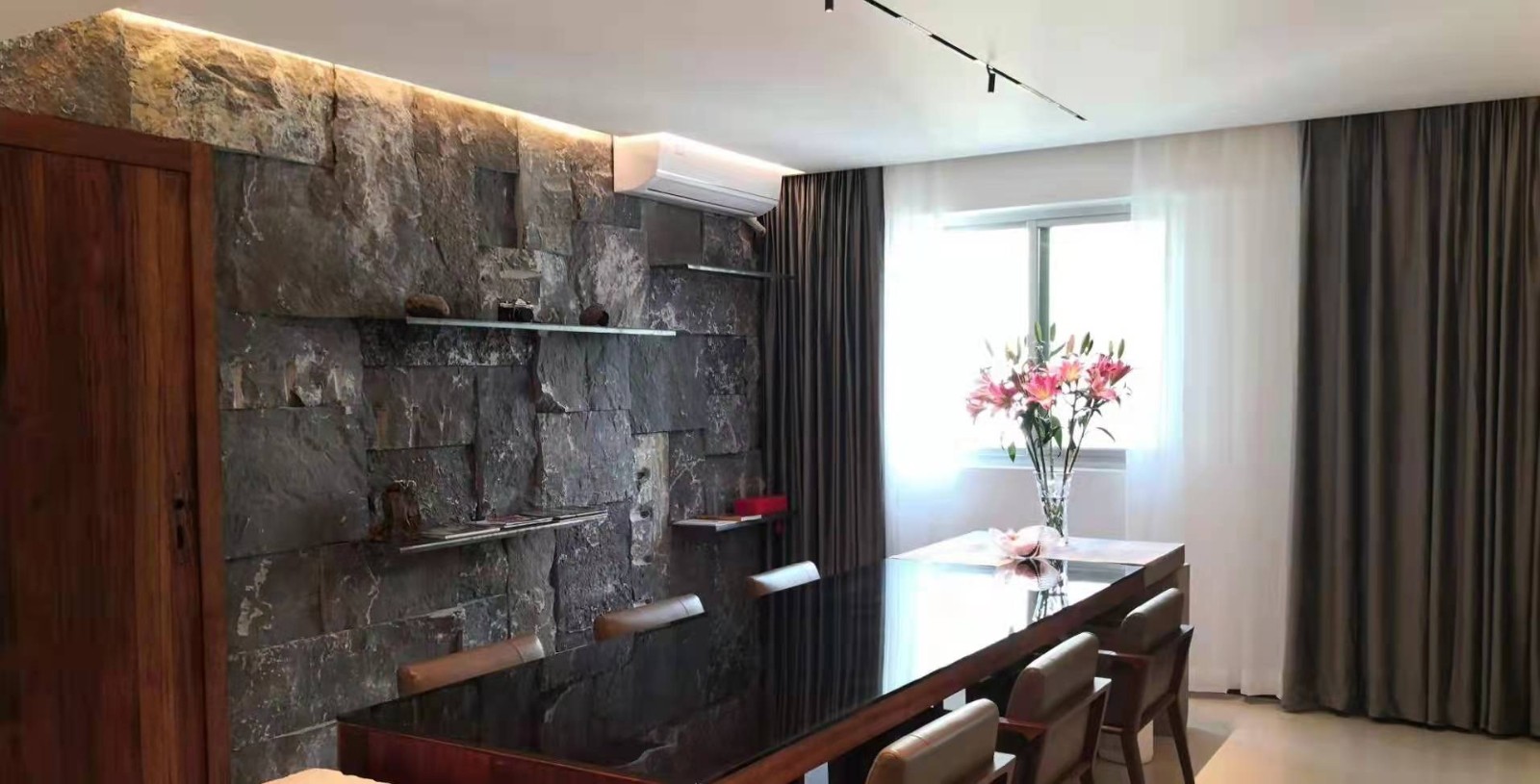 现代感与菠萝格觉得结合运用和黑玻璃现代感的椅子结合水泥的自然淳朴设计