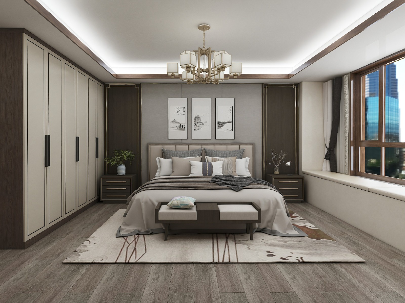 主卧室护墙板以及衣柜采用对称设计,衣柜门与墙板镶嵌了金属线条,为普通的木板增加了翻倍的色彩,视觉上感觉低调且厚重