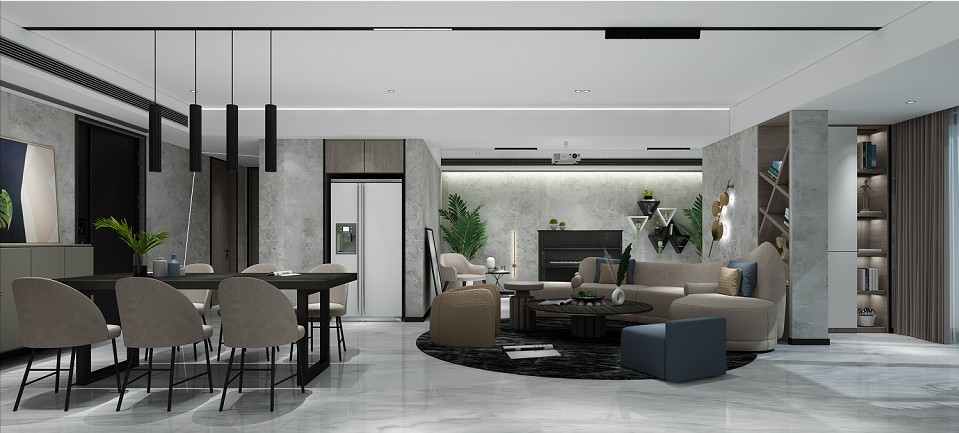 客餐厅一体化,客厅没有什么跳脱的色彩,以纯粹的黑白灰组合而成,不张扬但美观 无主灯设计,吊顶安装磁吸灯,实用美观而不显突兀。