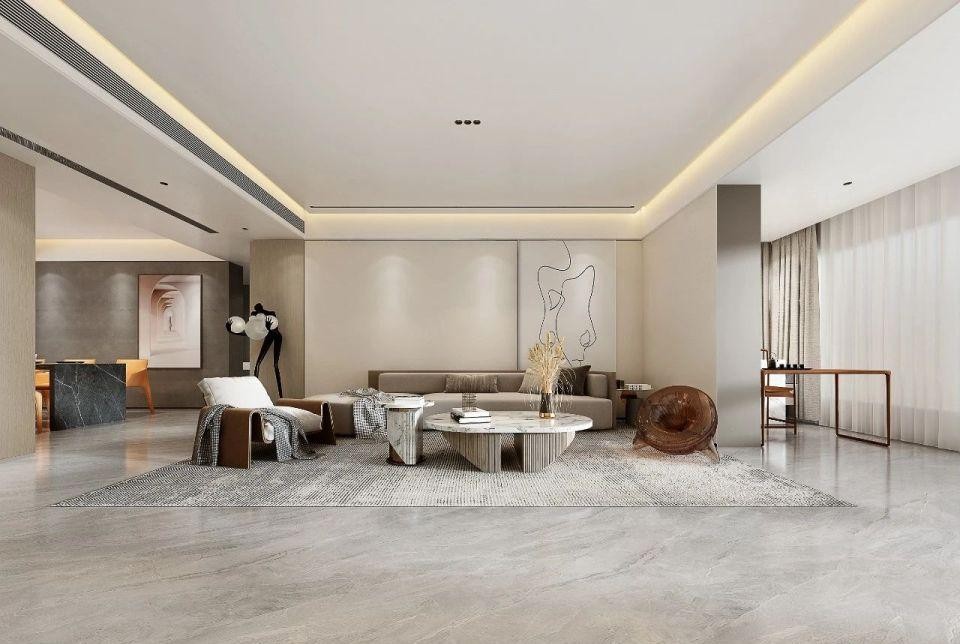 主空间以灰白与木色为基调,极简的造型、多种材质结合,营造舒适的生活空间。设计师用米白色来大面积的装饰客餐厅,营造简约的调性,没有多余的细节,只保留基础的功能和生活场景,柔和的空间节奏缓慢游弋着,赋予用户安定而惬意的心灵归属感。