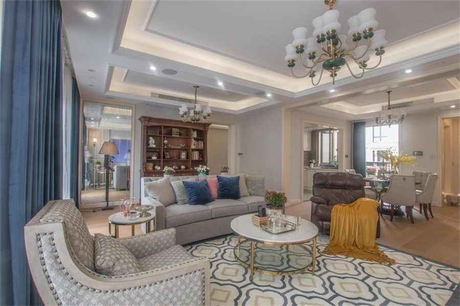 灰蓝色花窗格地毯与蓝色窗帘的相互呼应让空间更有整体感,地毯的搭配让空间不再冰冷,布艺三人沙发坐感舒适,透气并且包裹性强
