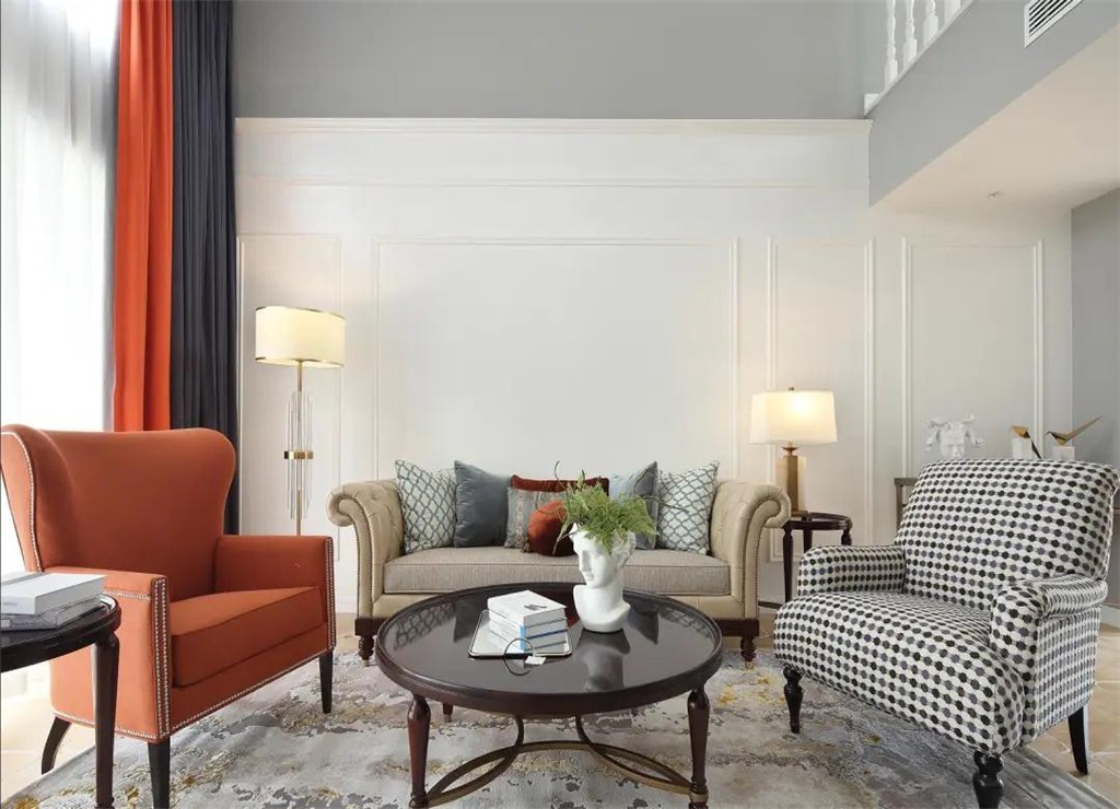 在这套280平米的复式户型中,整体空间以美式风格的硬装基础,在家居软装细节处加入大量轻奢质感的元素,布置上鲜艳活力的配色与装饰,营造出一种时尚而又轻松的档次空间感,客厅是挑高的空间,电视墙以壁炉造型布置装饰画,沙发墙上的护墙板加入边框造型,布置美式布艺沙发。