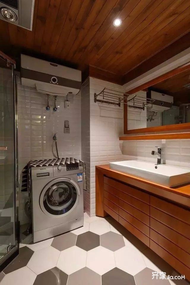 卫生间在六边形地砖基础,白色小方块墙面砖搭配,把洗衣机也组合布置进来,小空间的利用也是相对巧妙地