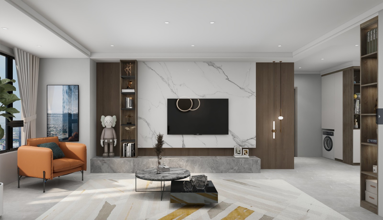木板护墙穿插石材背景并且加上一组通顶储物柜,简约实用