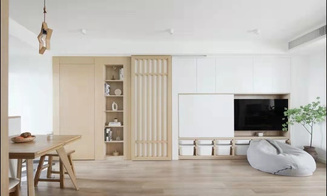 进入家门***眼可以看到的客厅视角,客厅开间较窄,取消了传统沙发、茶几组合,用一张懒人沙发和小坐凳,满足日常休闲功能,大面积的木元素,满足业主对原木气质的喜爱。