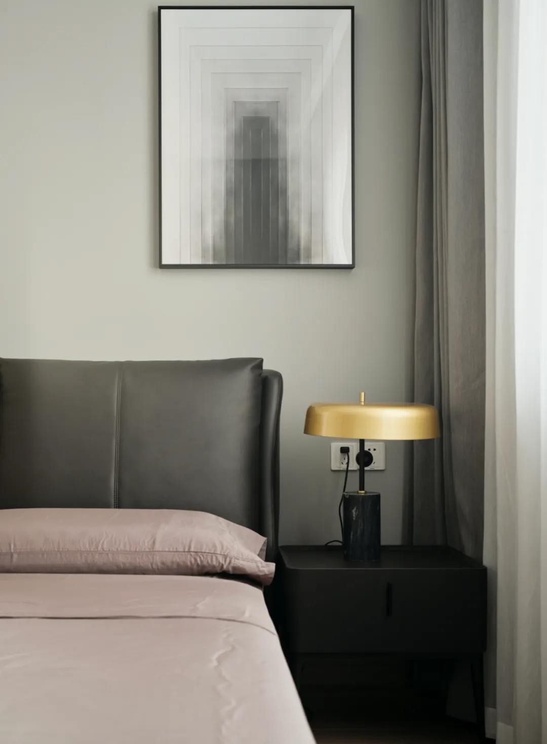 主卧挂画与床品的色彩相互呼应,弧形的窗帘盒中洒出的氛围灯光,无意间增添了卧室的温馨感