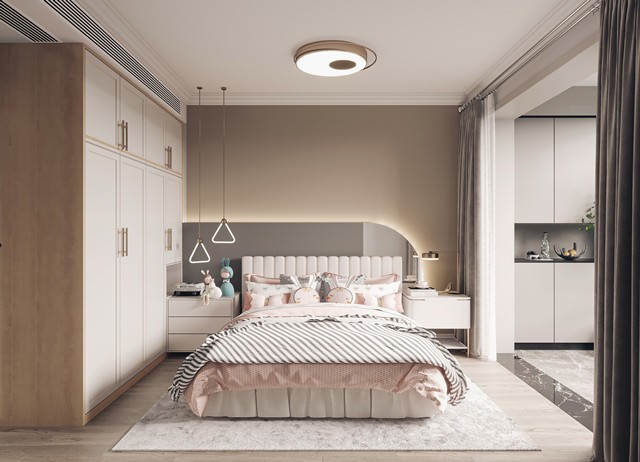 主卧室床头背景简单时尚,搭配灯光更方便实用