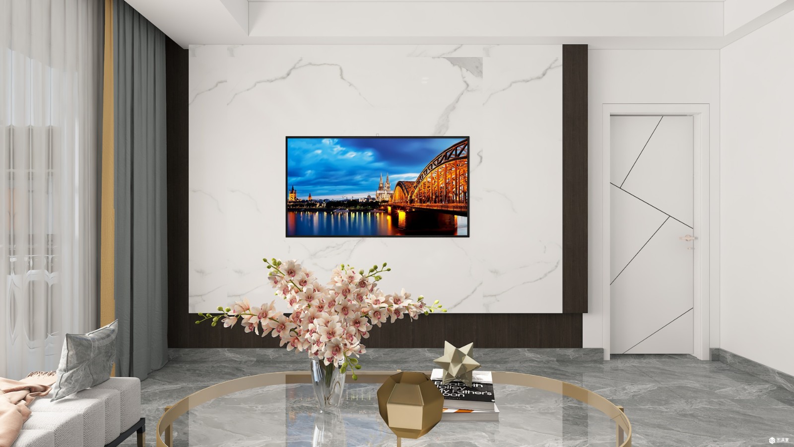 无主灯的顶,搭配通铺的大地砖,再配上简约风格的背景墙,用硬性的线条搭配搭配柔美跳跃的软装,凸显出简约轻奢的效果。