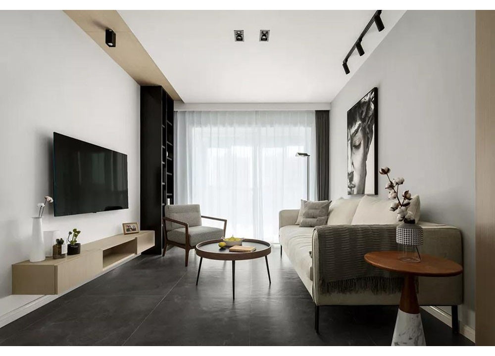 整个客厅主色调由深灰色地砖+白色电视墙+浅灰色沙发墙组成,另外加入浅米色沙发组合,以及木质元素的茶几和电视柜,打造出现代感极强的都市风格。