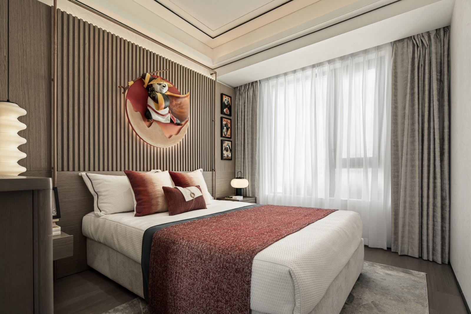 新中式床头背景墙,采用长城板定制,高档大气的吊顶别具一格