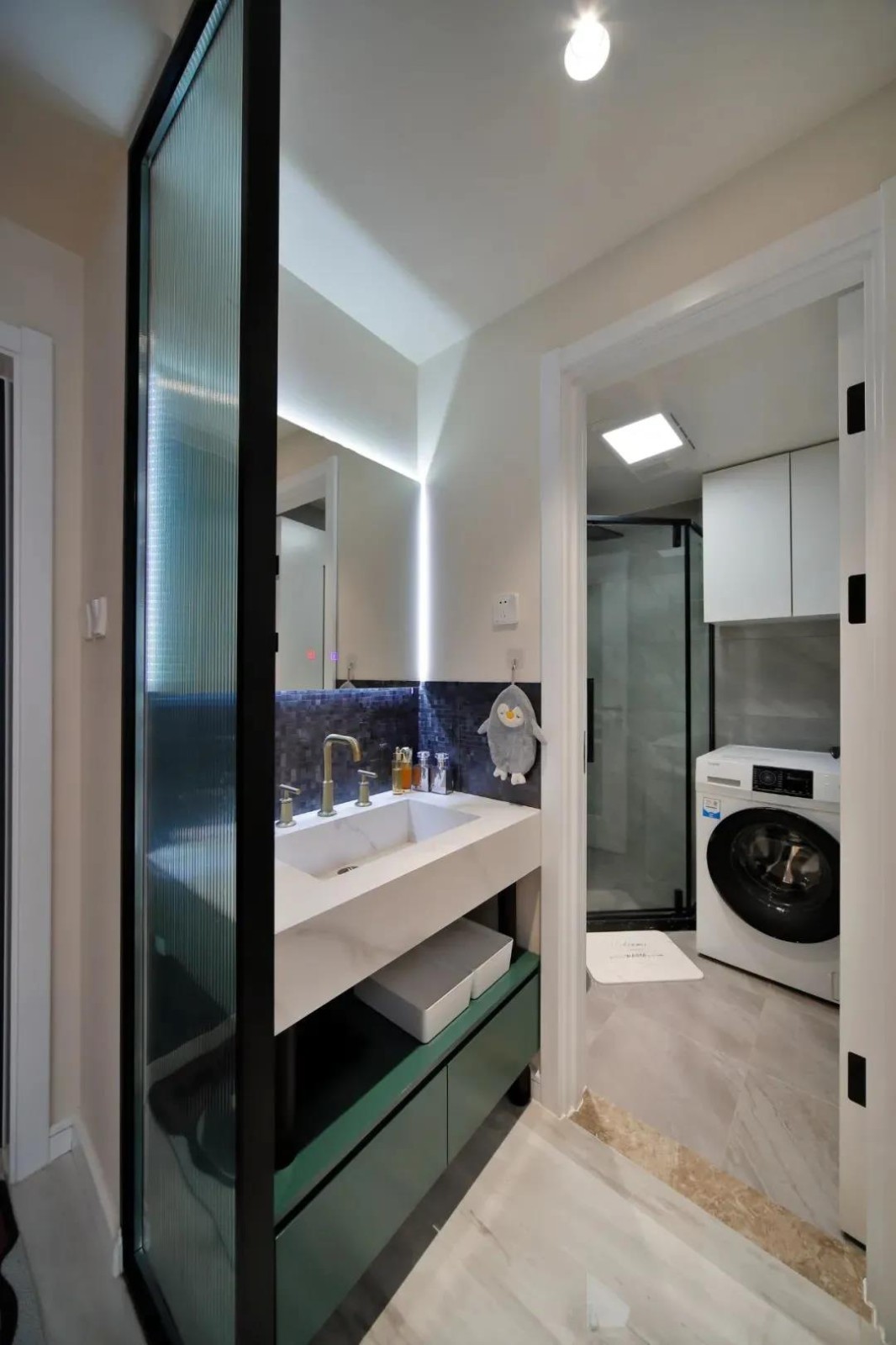 钻石型的淋浴间很适合小户型,节省空间又保证了干湿分区,洗衣机的上方空间也充分利用了起来做了吊柜,补充收纳。