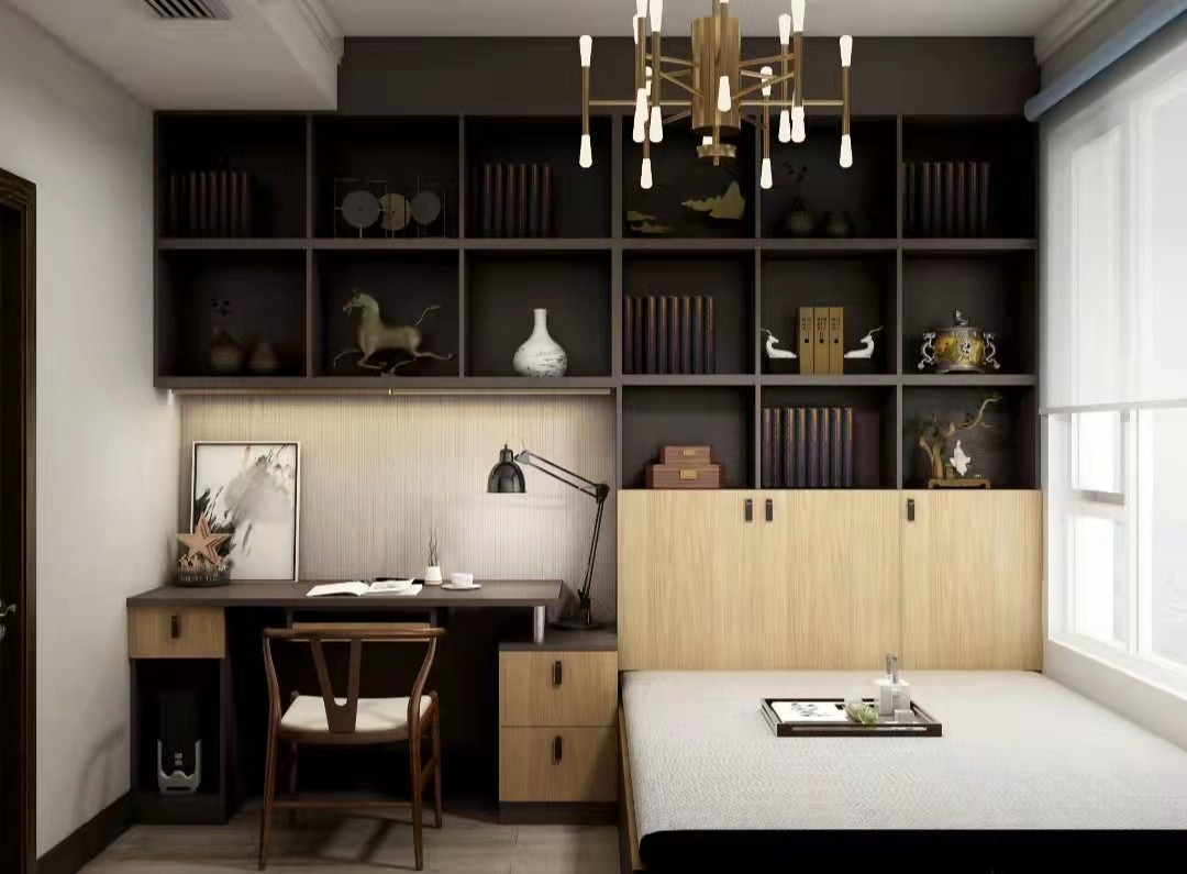典型的榻榻米加上书桌 墙上空间充足 小空间也可以有大用处
