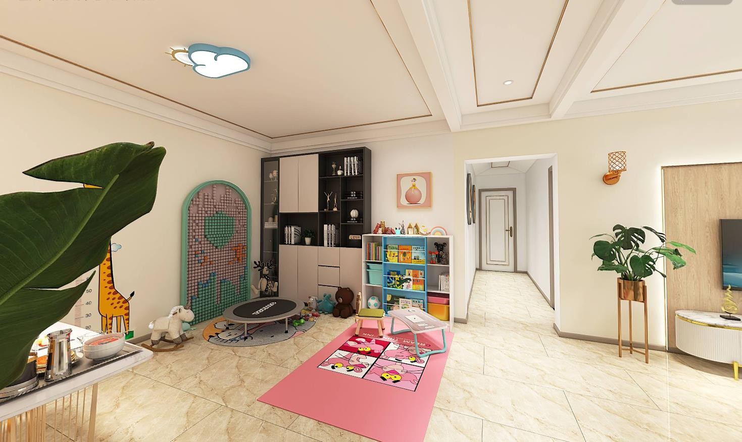 儿童房以淡粉***图案壁布为主色配合MDI胶 提高环保系数家具使用环保E0级板材