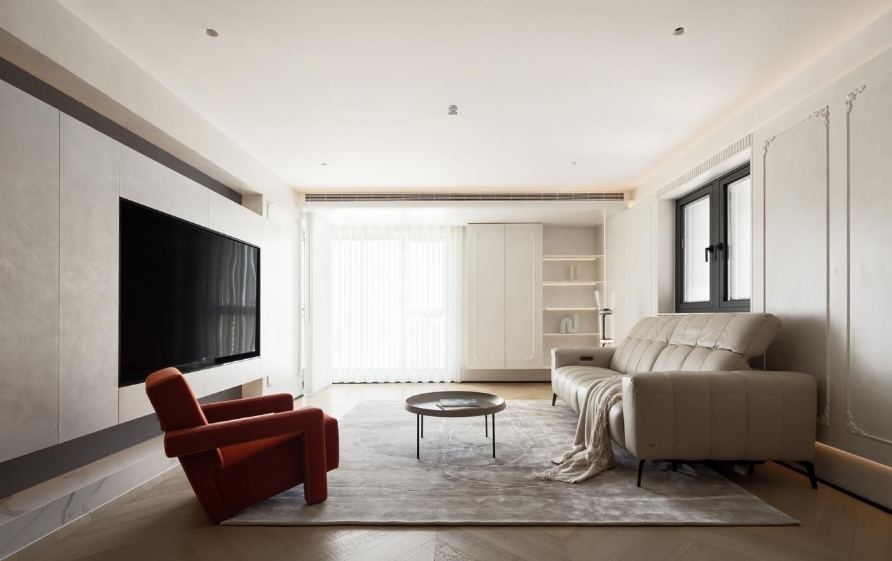 主卧的布局也延续简约的低饱和配色,空间以纯净大气为主。