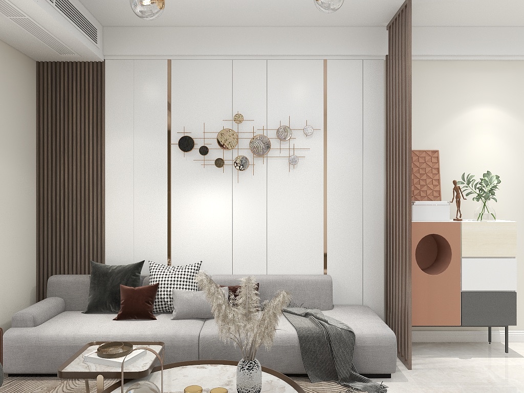 一套现代轻奢风的小户型二居室案例, 房子的餐厅和厨房结合在了一起,然后入户就是客厅,设计师也利用客厅做了不少的收纳设计。整个房子在现代简洁的基础上,加入了一些复古格调的搭配,让这个家看起来更有轻奢感,让人羡慕不已。 客厅电视墙没做过多的装饰,壁挂式电视位于墙面中间,看起来空间很大,但是不单调,高估而豪华,视觉中心也可以集中在电视上。
