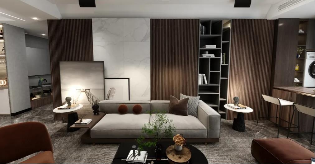 整个客厅利用长条沙发隔断出活动区域与影音区,还能额外为运动完做了休息区域还能将活动区域打造成书吧一区两用。用户为传统纸质读物的爱好者,如果不能合理收纳,不仅容易丢失破损客厅也会显得杂乱无章,破坏了美观度,不妨把电视墙做成展示收纳的定制柜,靠墙摆放深度350mm的书柜,层板可做活动层板,根据书籍大小进行调节,这样能很好收纳报刊杂志。