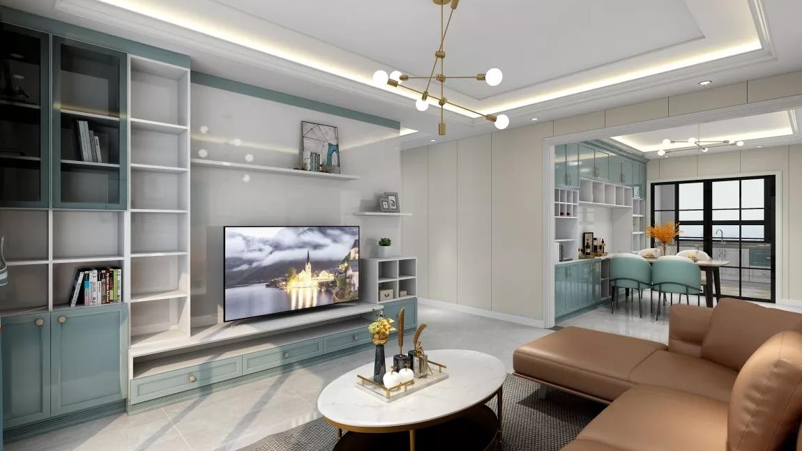 现代简约,清新蓝色为主体色调。墙面材料是集成墙板,全屋主要柜体都是现场制作或者定制。客厅有电视背景柜,沙发背景墙,咖色的沙发调整了空间的色调,使之协调平衡。餐厅也采用一体化餐柜。整体空间清新,时尚,简洁,自然大气。