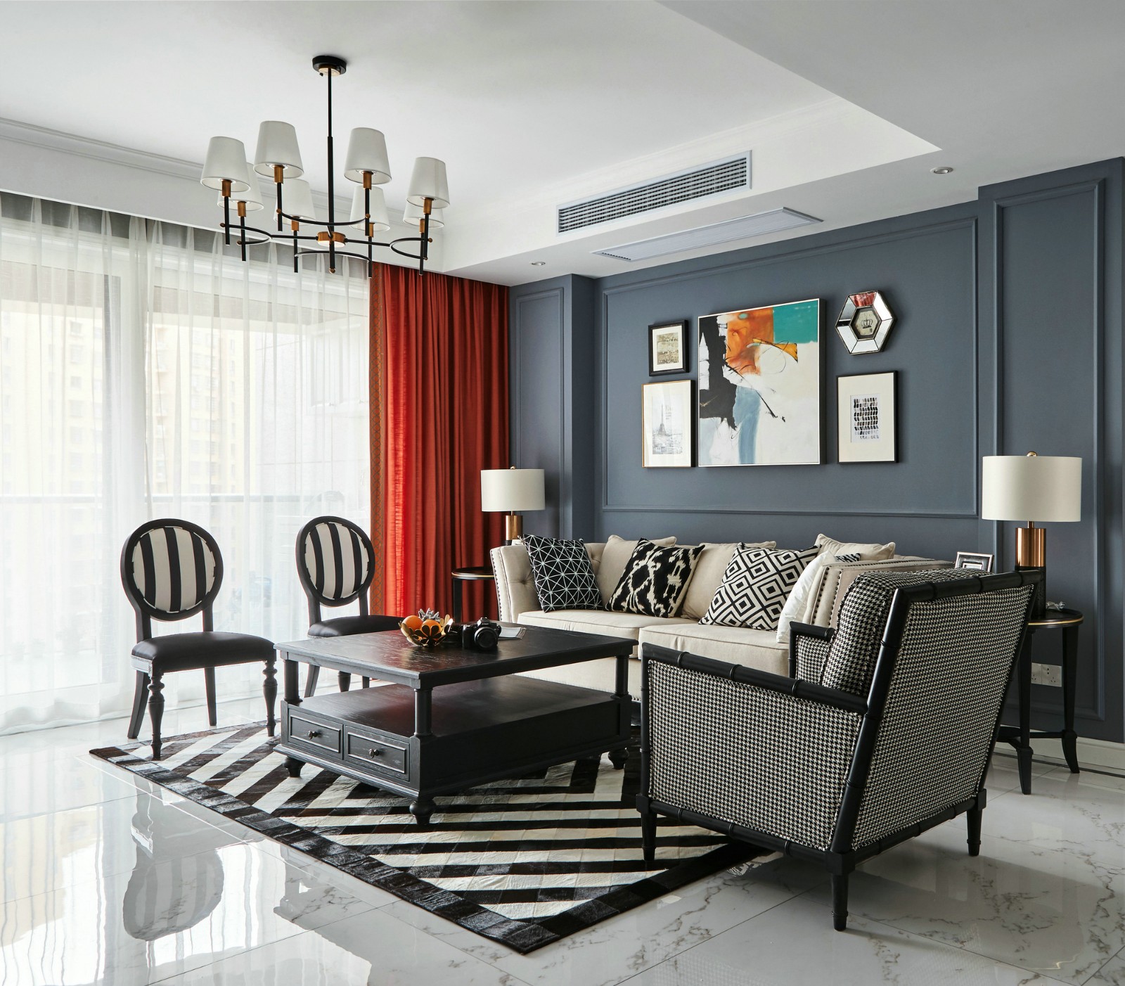 客厅配色以黑白灰为主,家具造型简单但不失大气,挂件图案用色大胆,给客厅增加了一抹色彩与活力