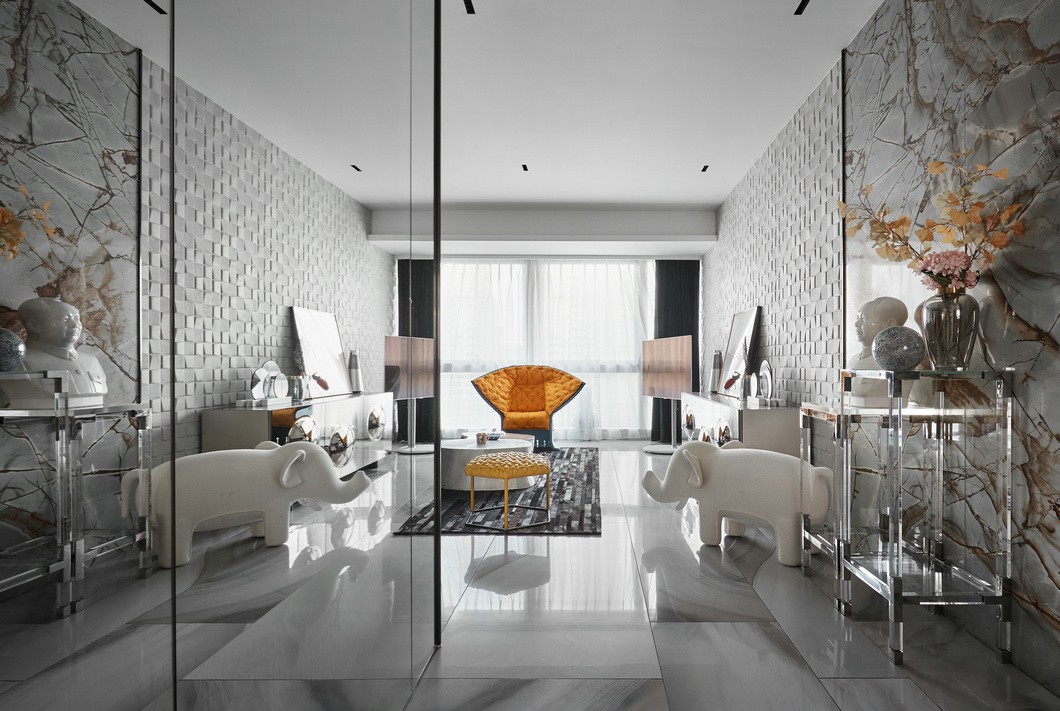干净利落的灰白色调中,弧形的线条游走其间,引一抹橙黄入室,恣意盎然,生活的百态让我们驻足。