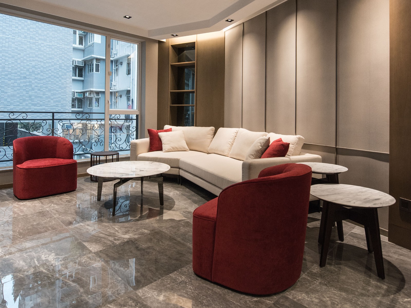 设计师通过对使用者在空间中互动关系的细致设想,反复推敲布局,再把陈设元素中的材质、纹理、色彩交织碰撞,着重关注红色主调的细腻过渡,最终营造了空间丰富的视觉层次效果,让主色调的表现更具张力。