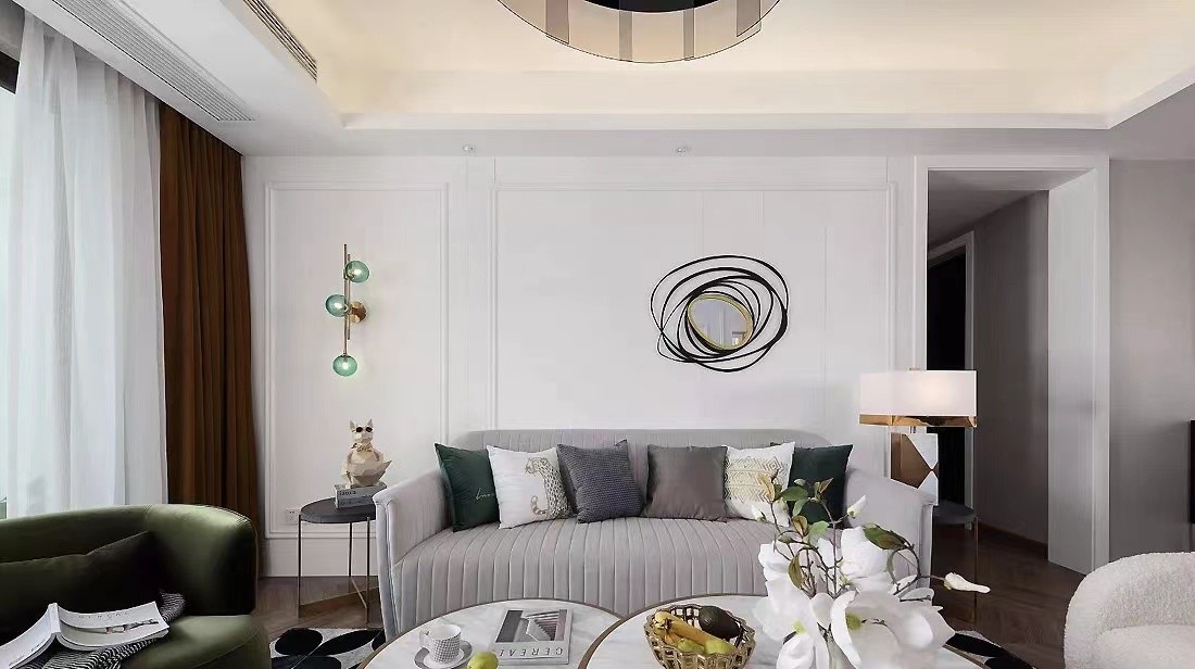浅灰色布艺沙发触感柔软,为空间注入了一种优雅之美。金色与墨绿色组合的壁灯细腻优雅,提升了空间的设计与美感。