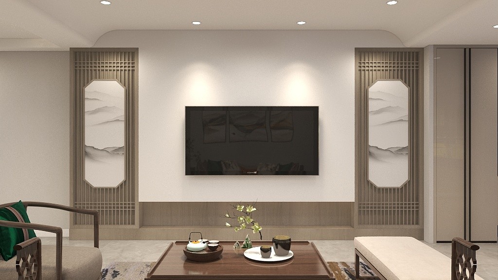 客厅电视背景墙,加入中式花格,中间留白