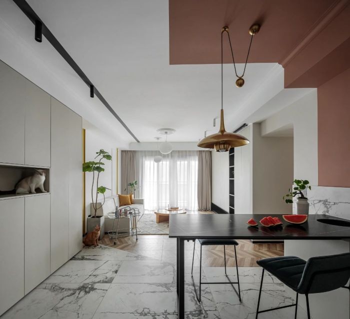 空间大面积留白,黑色线条从入户贯通到客厅,乍看像是筒灯轨道,实则乳胶漆的分色处理,在视觉上制造无秩序的反差美。 “线”的秩序美,进一步丰富了空间层次和穿透力。
