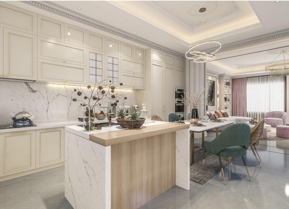 餐厨一体的开放式设计,岛台餐桌的完美结合使整个空间看起来更大气奢华