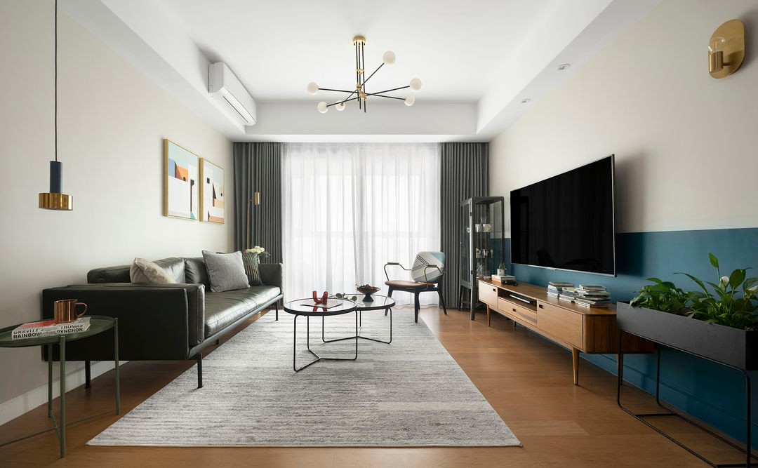选择电视背景墙面做柔和白+蓝绿色的上下分色搭配。