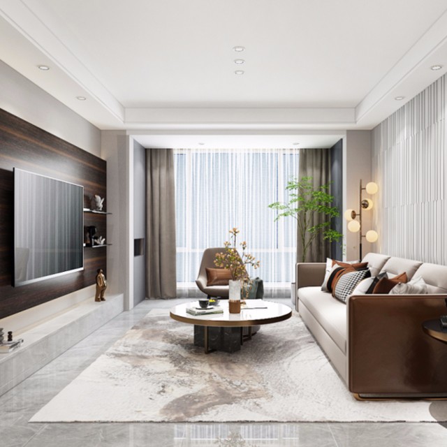 客厅采用无主灯设计,凸显现代风格的简洁大方,背景墙木纹板灯带简洁装饰,不复杂