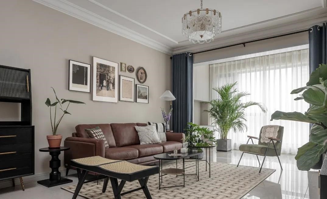 客厅保留原始地面加铺奶咖色地毯,墙面选择浅奶咖墙纸,柔和而舒适,具备很强的包容性。