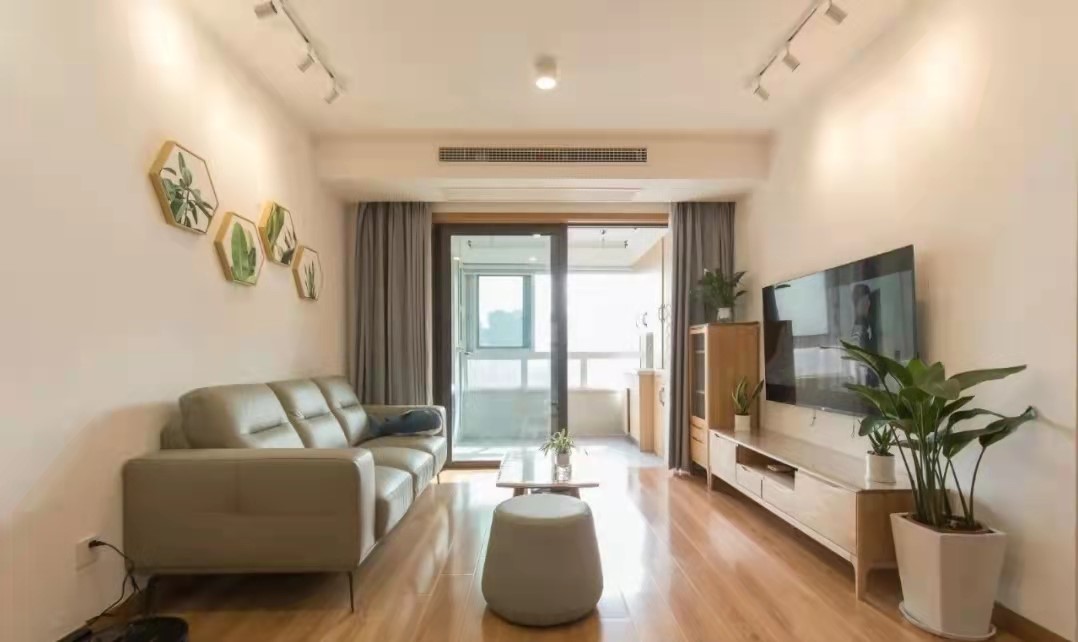 浅黄色的墙体和仿原木色地板构建了一个自然而温暖的主体环境,即便身处内室也是如沐春光。不管是沙发还是电视柜,都是温和系的纯色,一目了然,柜边的绿植盆栽,更是给室内带来草木的盎然生气,氛围协调且清爽。