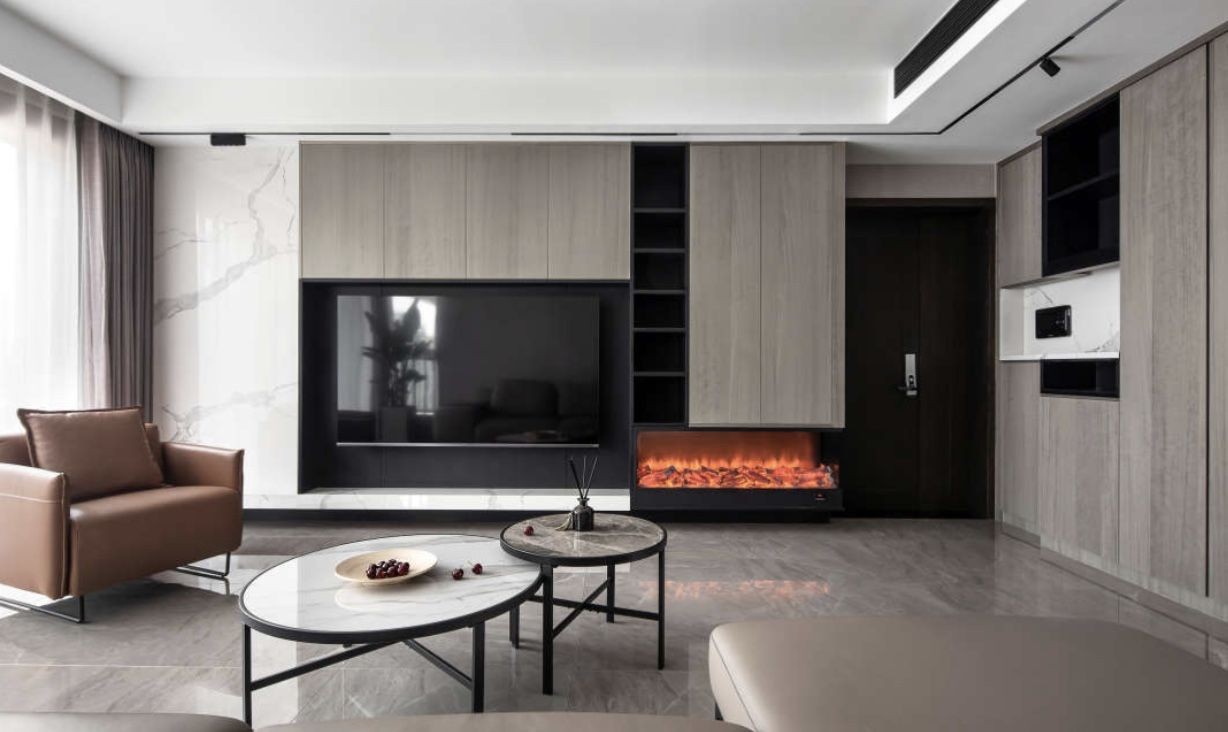 整个客厅的视觉焦点就用浅色的石材与涂装板,石材在造型上我们选做了一个地台,可以将落地音响或者自然植物等装饰放置在地台上,增加电视墙区域的立面层次感。
