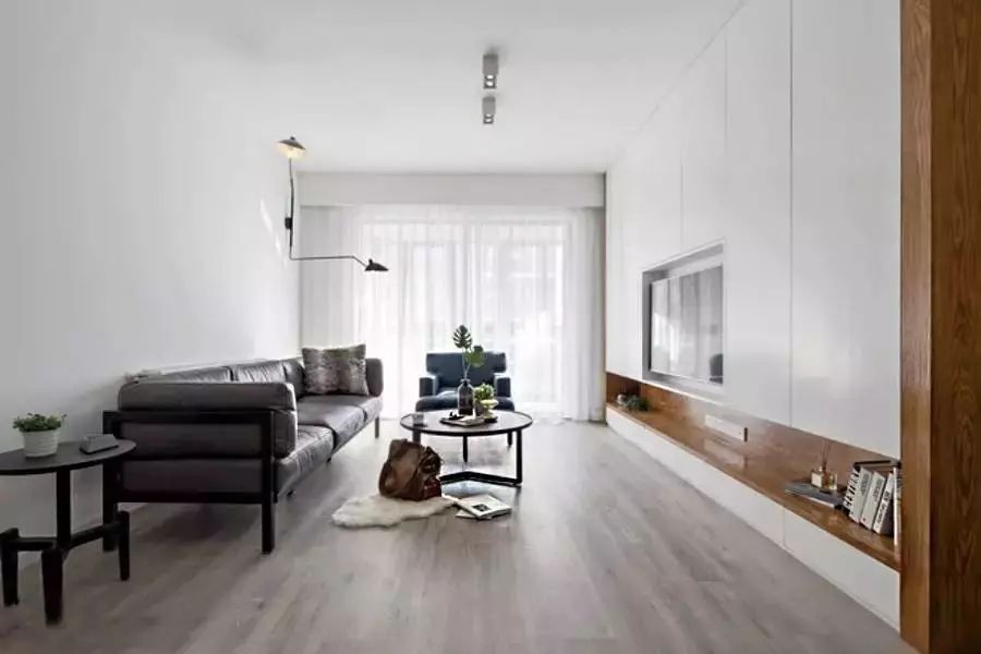 整体采用白色与木色为主 背景墙做成储物柜 有较强的储物功能