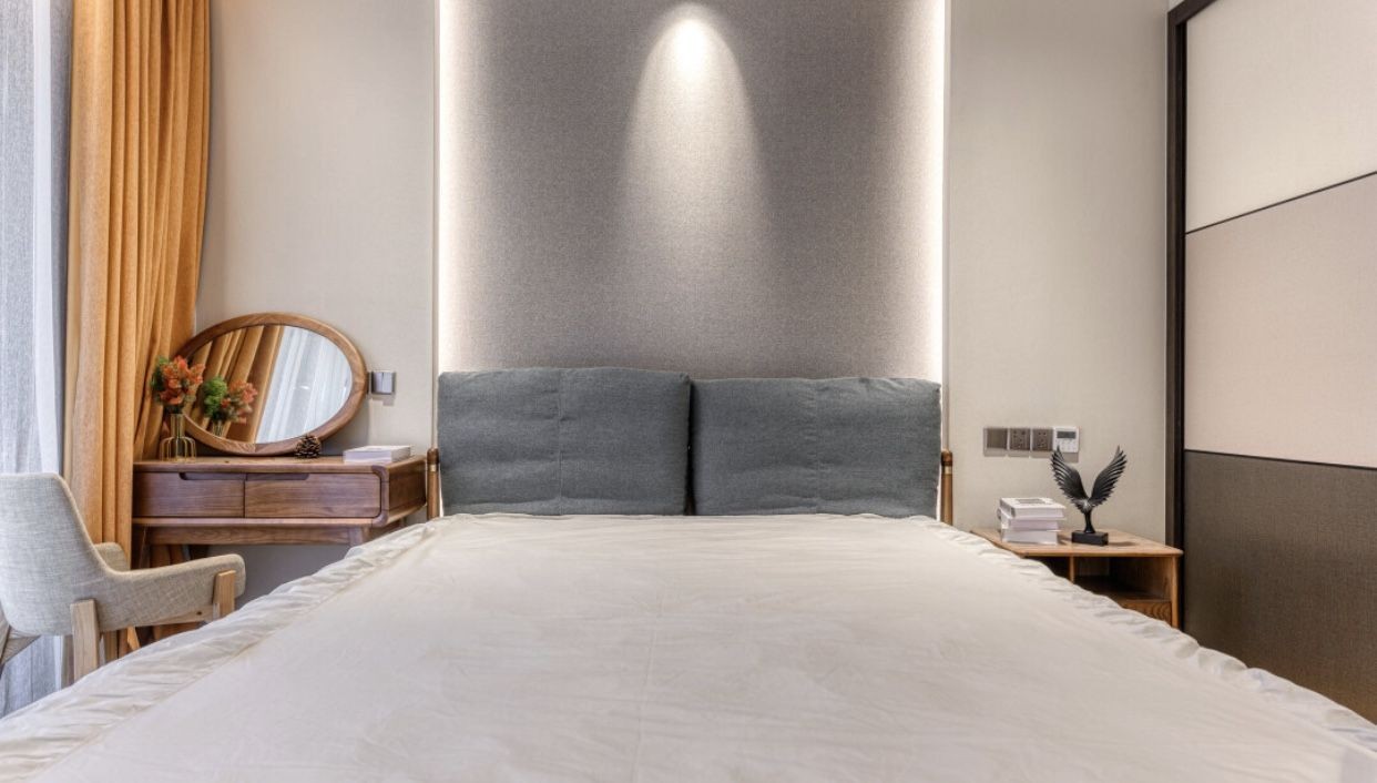 主卧空间大了不少,所以可以有空间做了一个大衣柜。而且灯饰的装饰也是很有特点的,让人眼前一新的感觉。