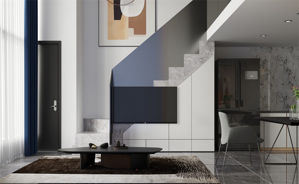 由于层高不很理想,在这个空间我们利用搭建钢架结构的上下错层理念结合人体舒适度进行总纵向整合,***的把储物功能和舒适度做到***,来满足小空间大储物的居家需求。