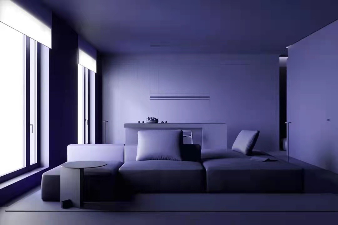 主卧室用白色作为主色调,床的后方紧挨着衣柜,展现出别样的设计美学。落地窗保证了房间充足的光线。同样有紫色元素的存在,显得***自然。