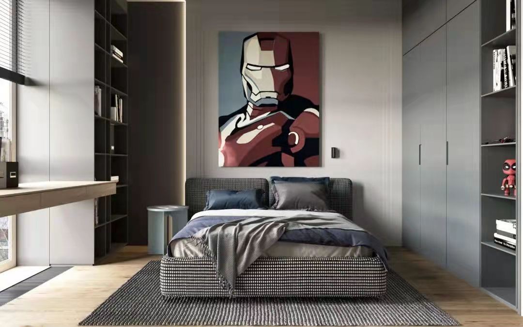 储物架与衣柜皆为黑灰色连接着白色墙壁,墙壁正中摆放具有科技感壁画