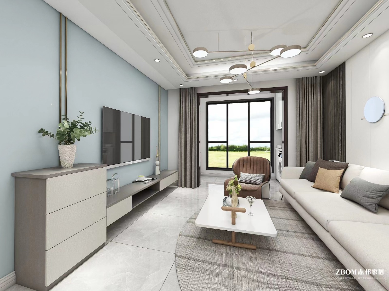 客厅想要保持清爽透气,那么就靠窗帘来选择一个可以使用时柔和舒适的大平顶,暖色调即便是小户型也能有温暖整个空间,充满温馨。