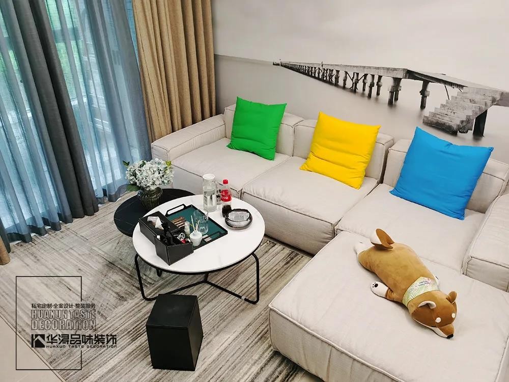 本案强调的是用低调简约的设计去迎合房子原本该有的实用性。“不多不少,刚刚好”,客厅的摆设表达了一种恰到好处的生活态度,米白色的布艺沙发搭配抽象线条的地毯,定下简约大方的基调,沙发背后的墙画营造一种“不止于此”的意境,延伸了视觉带来的想象力。