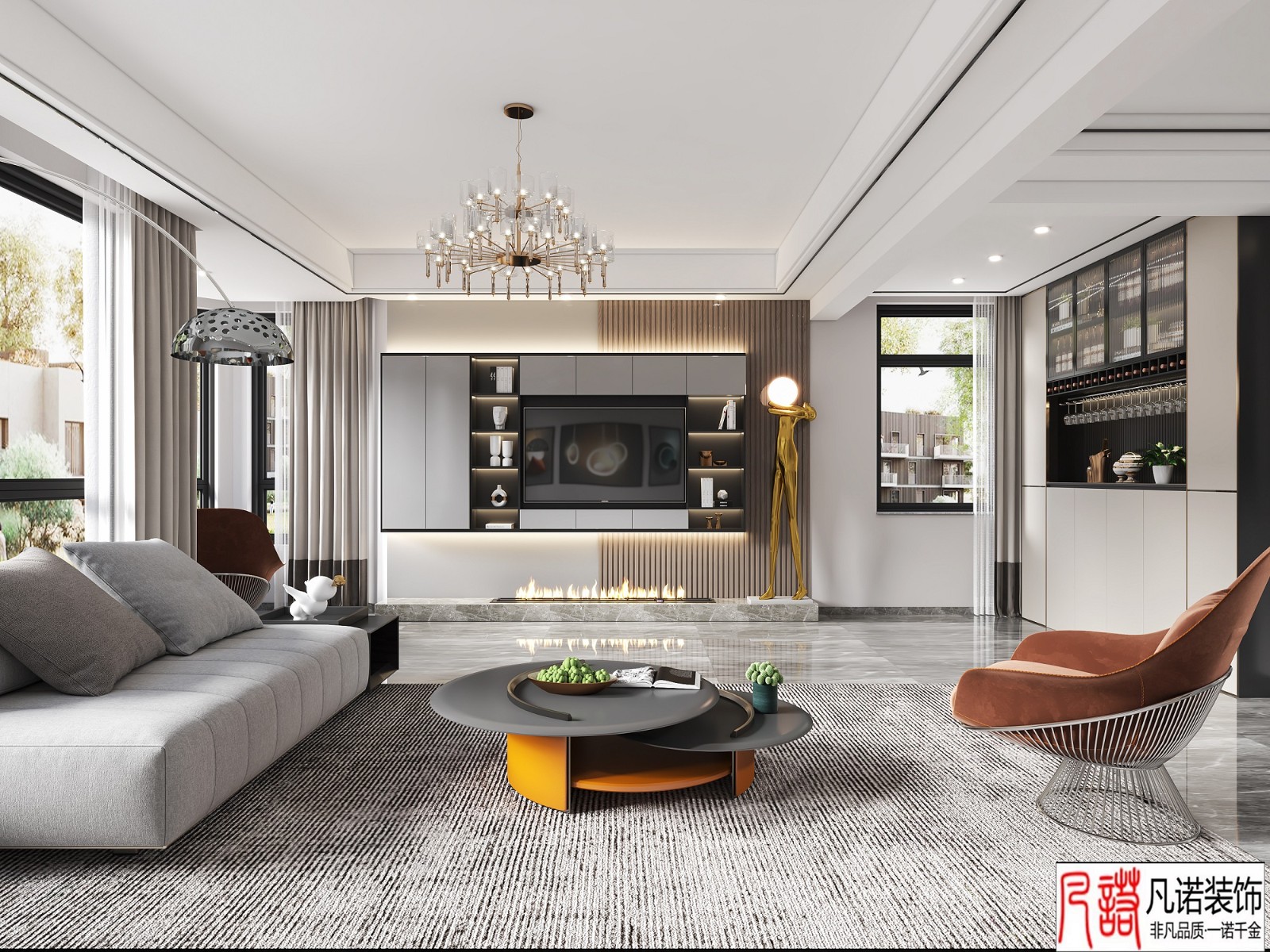 客厅电视背景以定制层架和撞色格栅为主题,线性灯光为辅助,凸显时尚的同时也兼具精致.