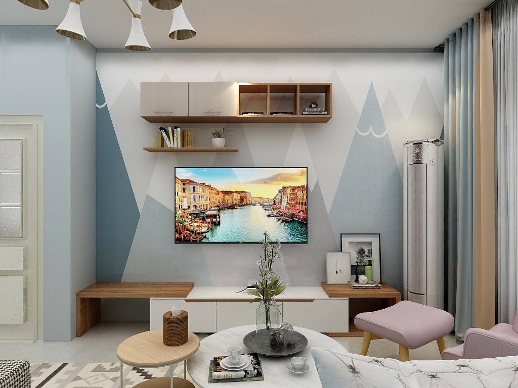 电视背景墙采用的是拼色壁纸的背景墙,与家里边的整体装修风格是比较搭配的,视觉效果也是比较突出的。