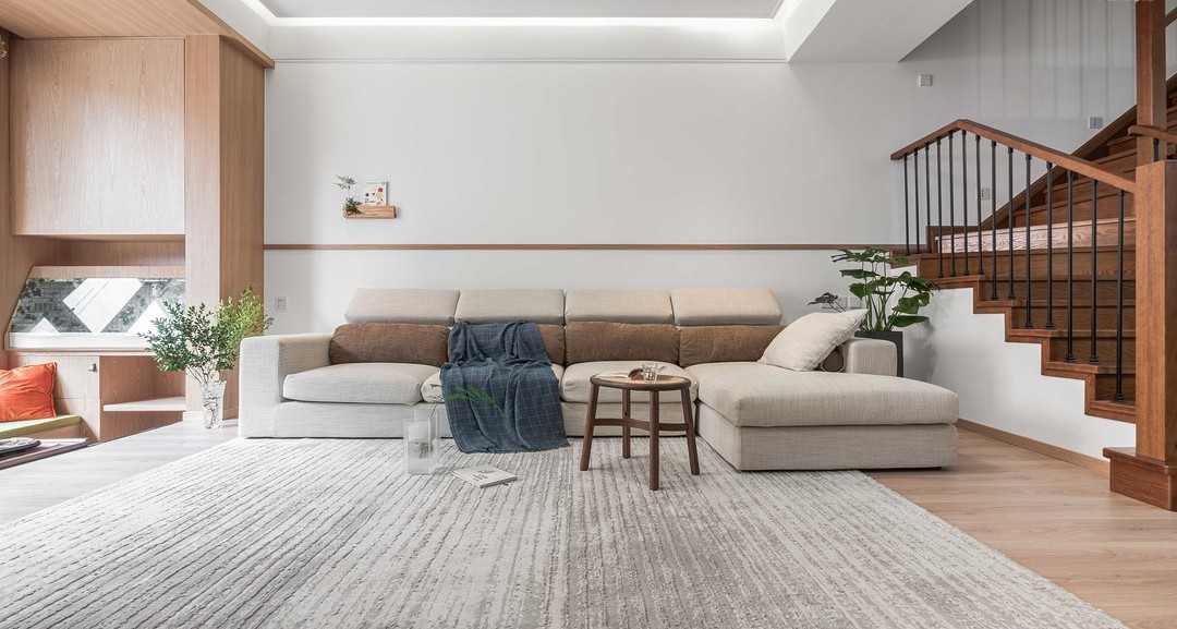 客厅以白色和天然原木色为主,点缀橄榄绿,让整个空间在色彩上很温润舒适。以大量的原木为主,纯净的白色乳胶漆,呈现被大自然包围的气息感。
