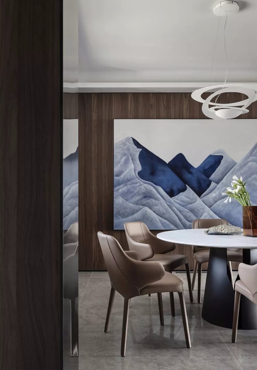 明暗关系中,灯光熠熠 点缀的画,鲜明的色彩升温氛围 客厅简净,倚此而坐,唤醒回忆,接纳彼此